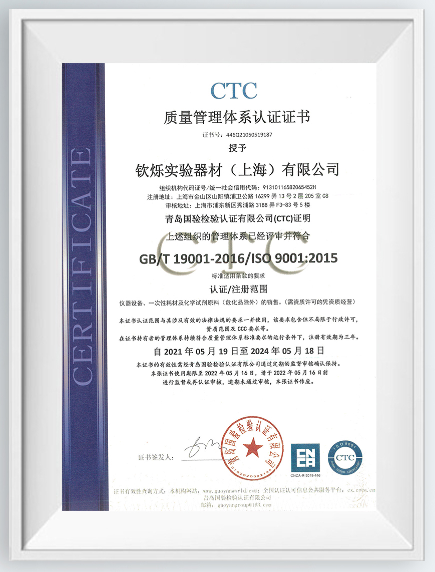 钦烁实验器材(上海)有限公司 成立于2011年,是一家专注于实验室分析、检测设备,检测仪器以及相关耗材的综合型实验室产品服务商。2019年我们获得高新技术企业认定证书,延续至今。